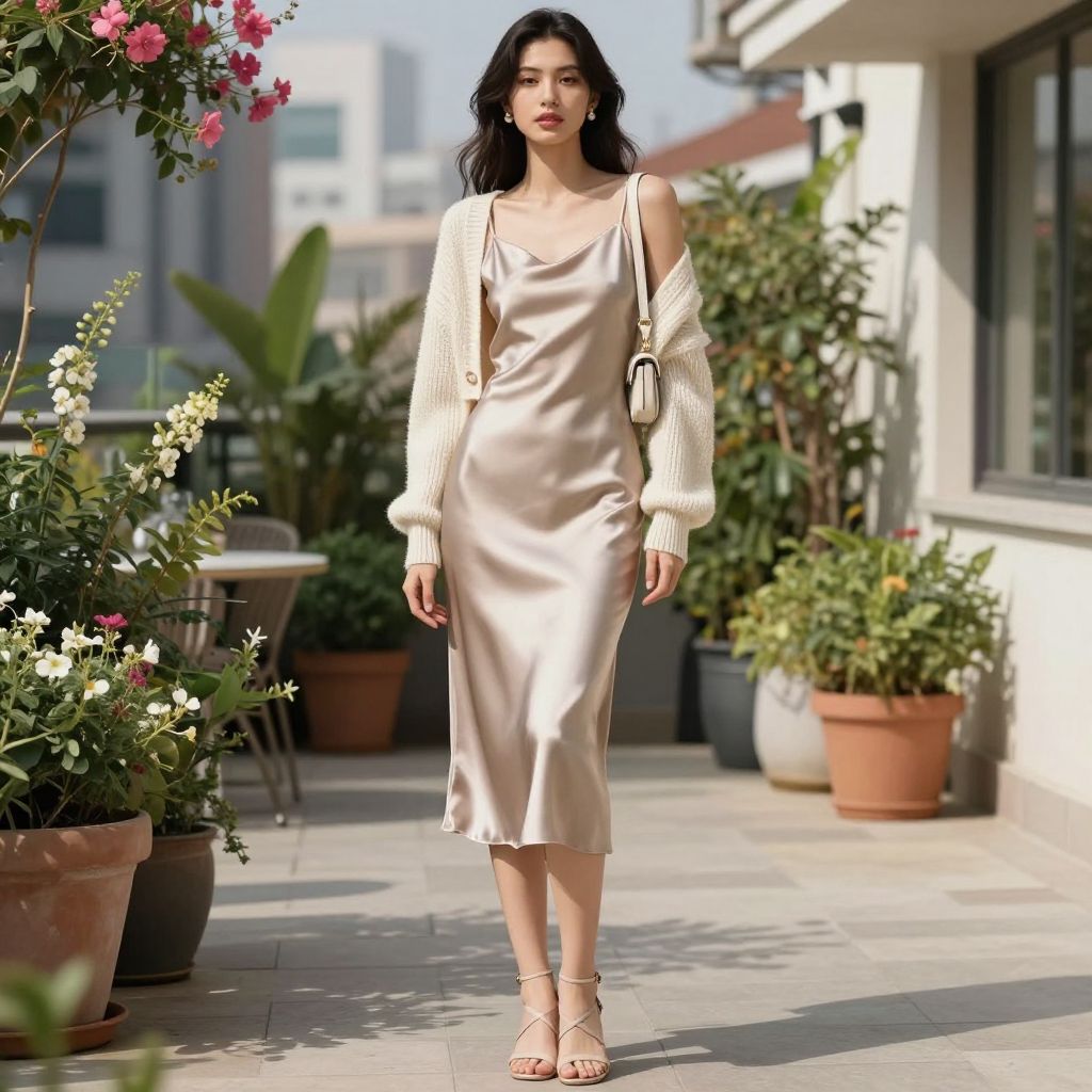 - Key pieces: satin slip dress, lightweight knit cardigan, strappy sandals