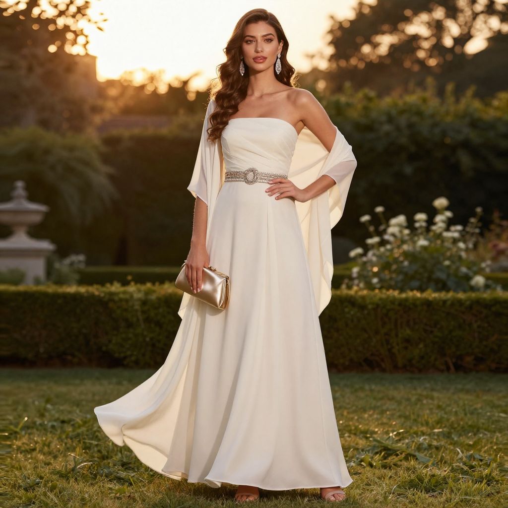 - Key pieces: strapless maxi dress, statement belt, heeled sandals