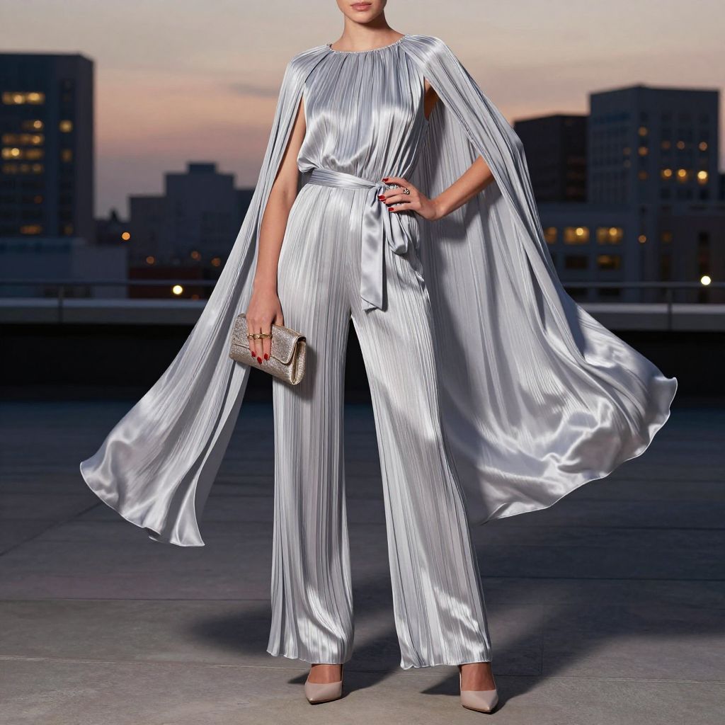 A pleated jumpsuit with a cape sleeve moves like liquid each time you clap for the grads.