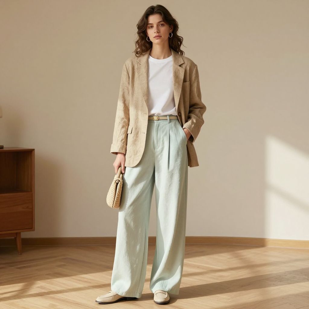 - Key pieces: linen blazer, white cotton tee, pastel trousers, loafers