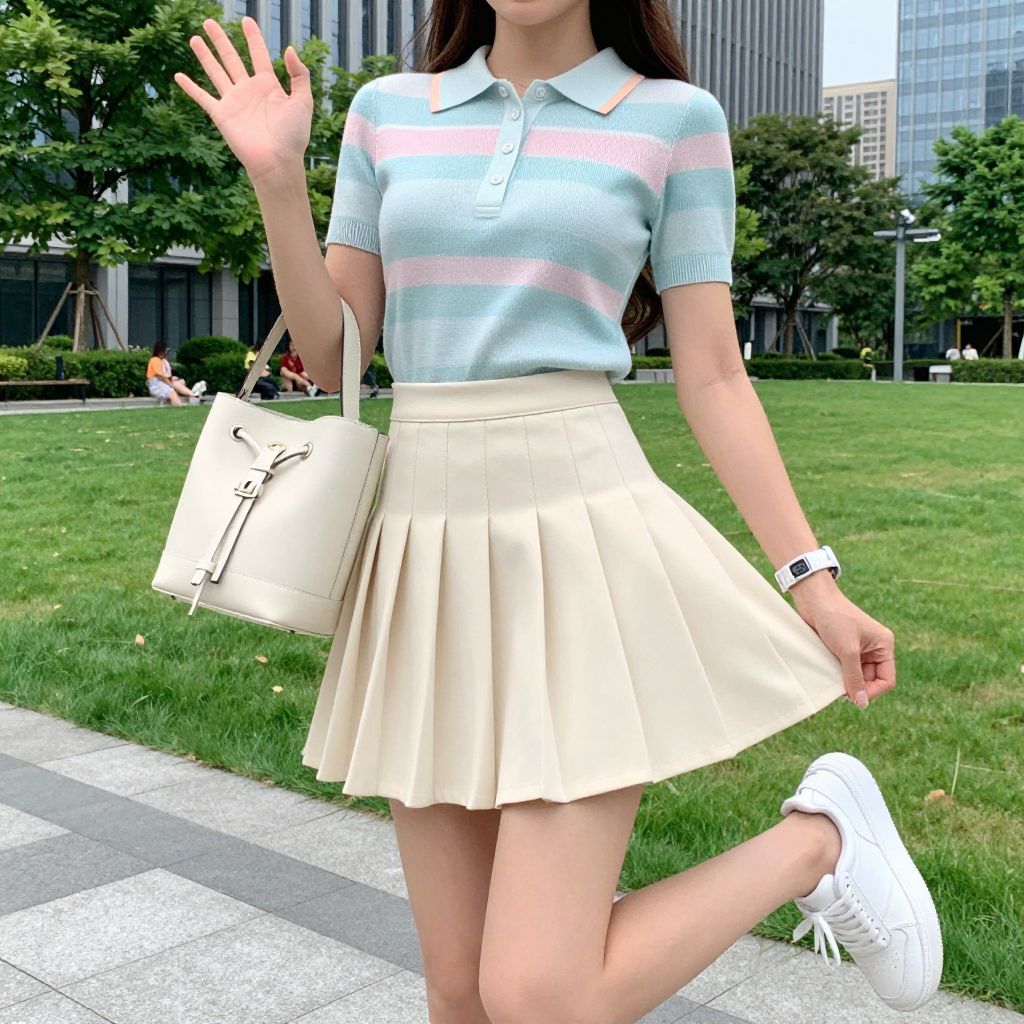 - Key pieces: knit polo, pleated skirt, white sneakers