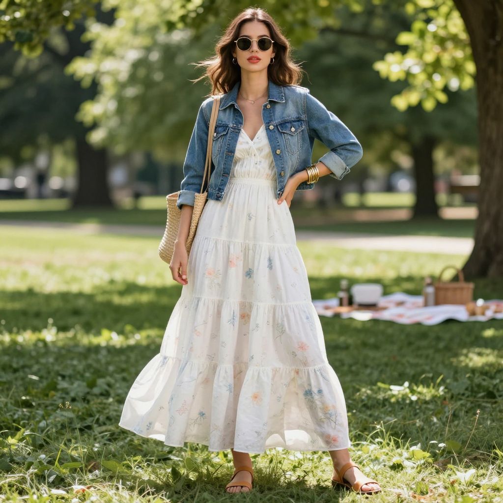 - Key pieces: tiered maxi dress, denim jacket, flat sandals