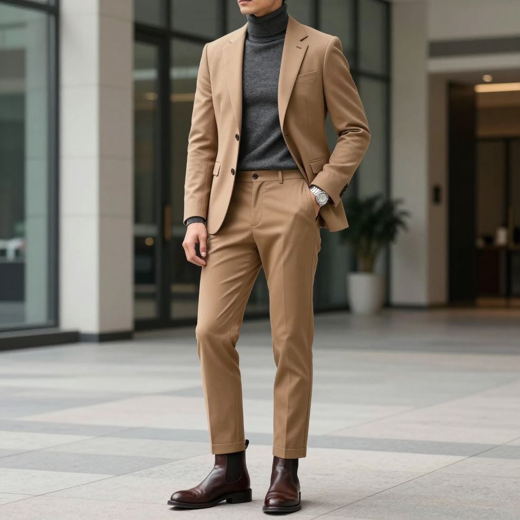 The camel tone flatters most skin tones and the slim cut reads modern with minimal effort.
