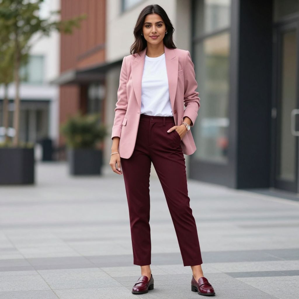 - Key pieces Burgundy trousers, pink blazer, white tee