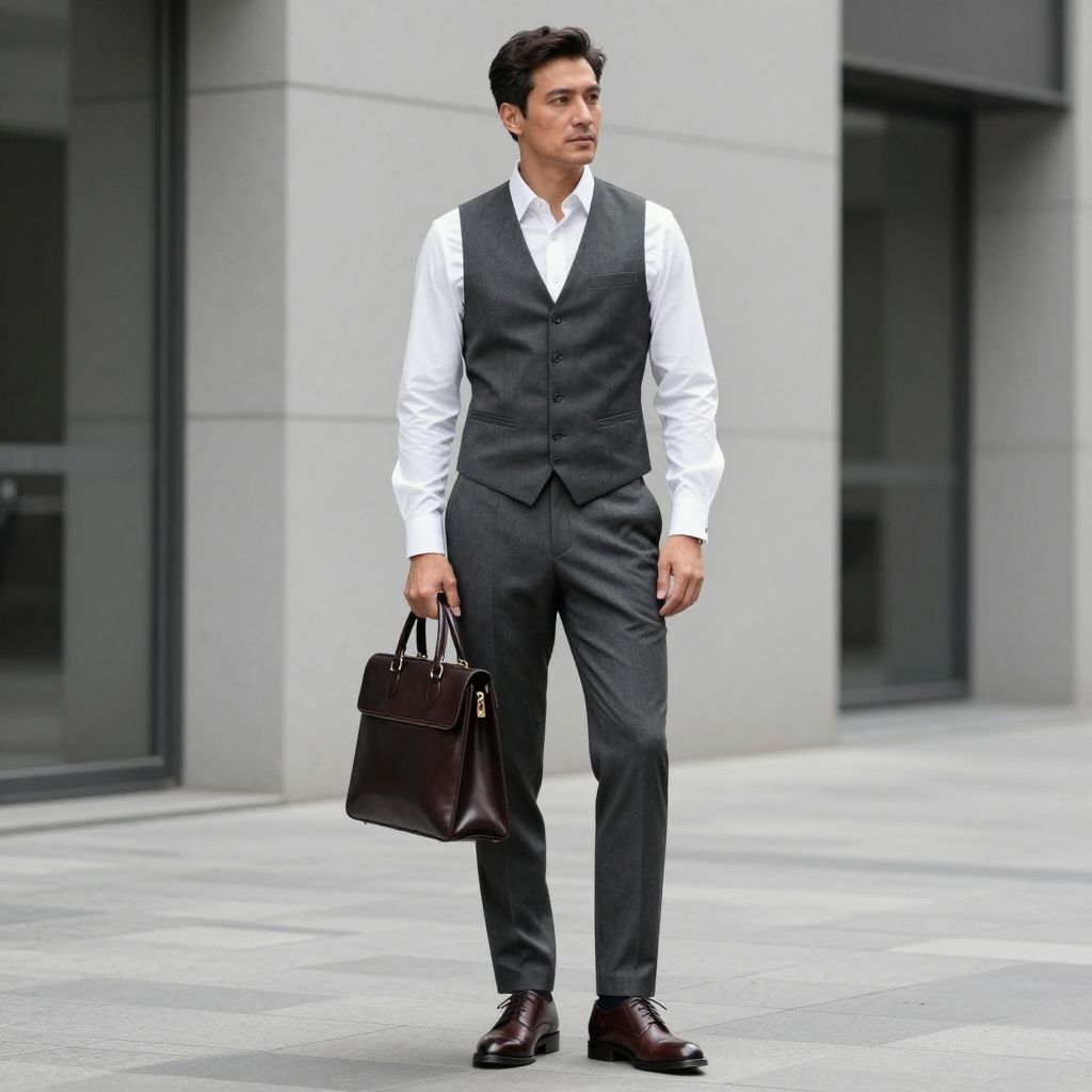 - Core items Charcoal vest, matching trousers, white poplin shirt