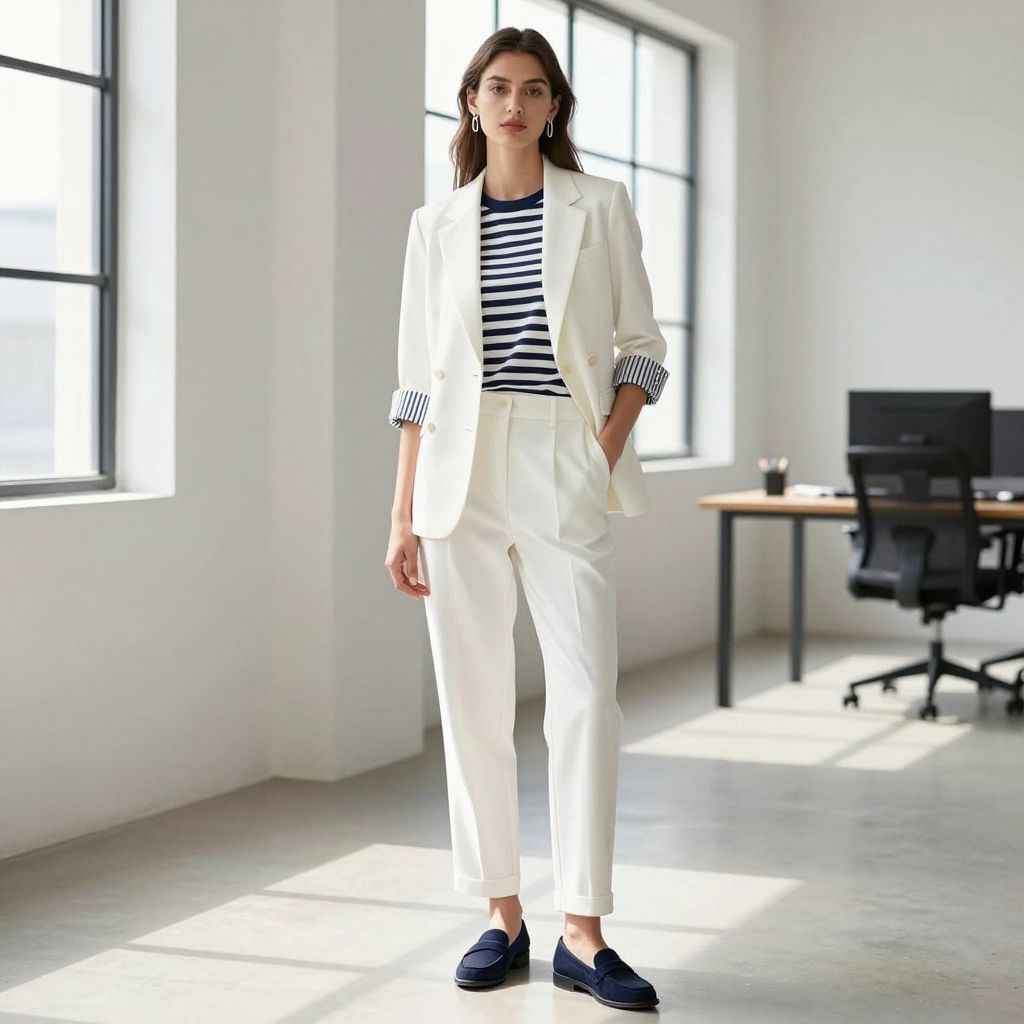 A white trouser suit shouts confidence yet feels fresh instead of stiff once you slip in a navy Breton tee.