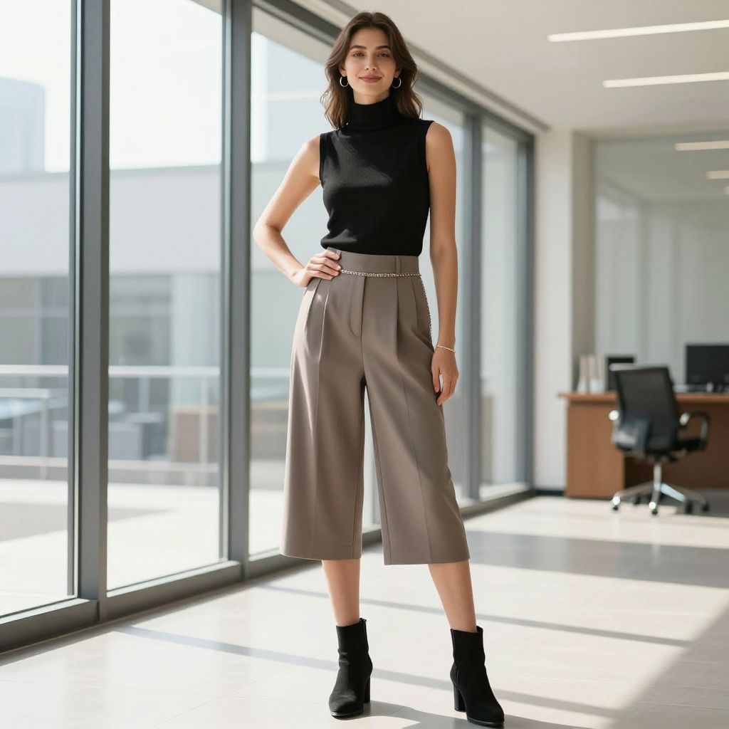 Taupe pleated culottes give breezy movement and pair smartly with a fitted black sleeveless turtleneck.