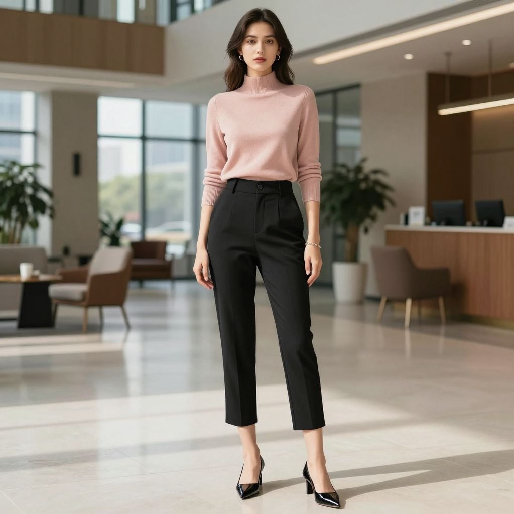 3. Black Cropped Trousers With Blush Mock Neck Knit