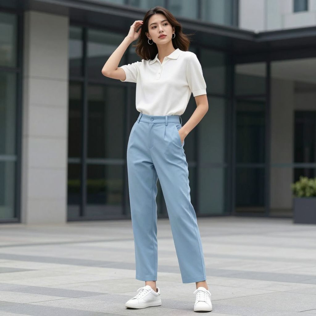 Powder blue high waist trousers set a fresh tone that lifts mood at eight in the morning.