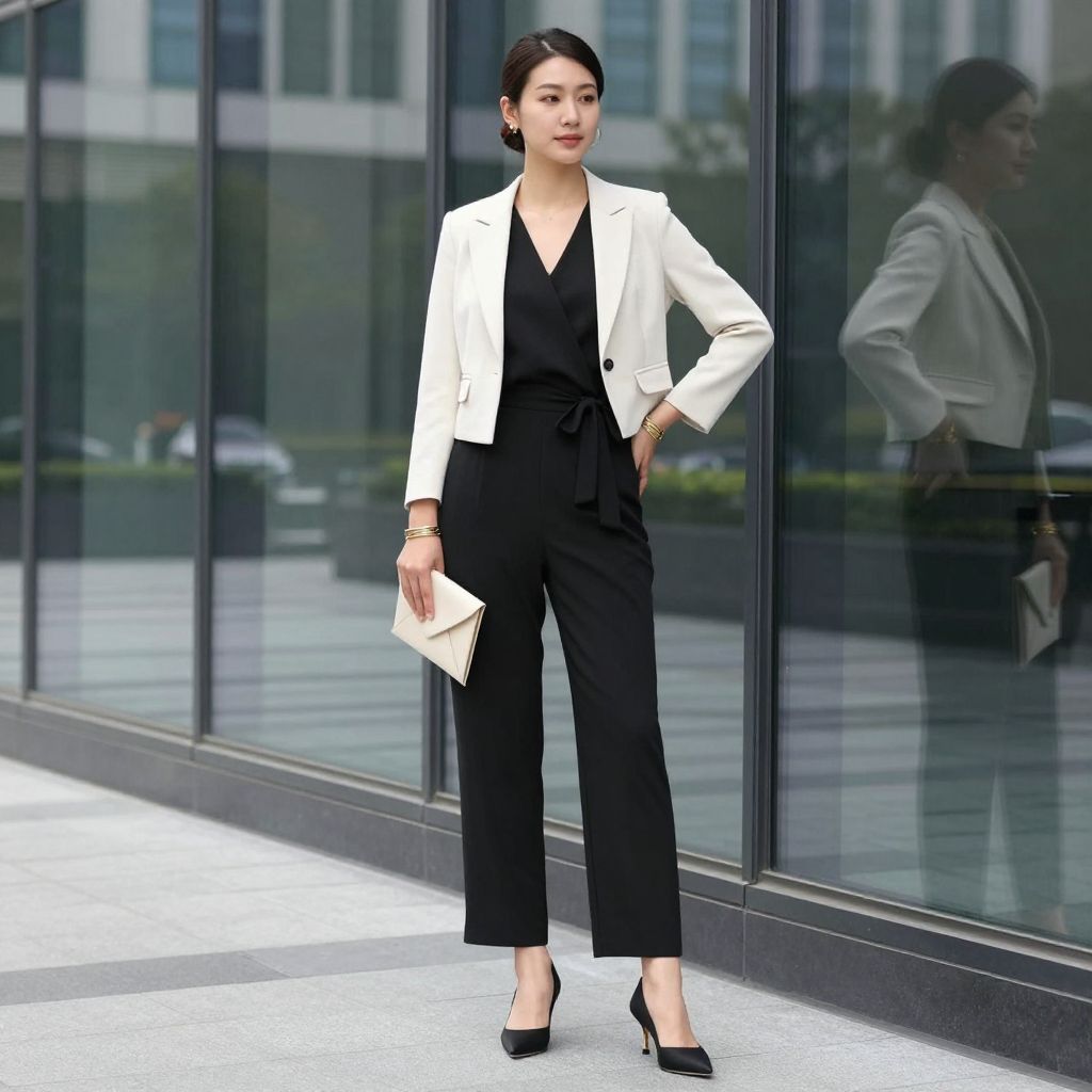 A soft black jumpsuit feels comfy yet looks boardroom ready once you add an ivory cropped jacket.