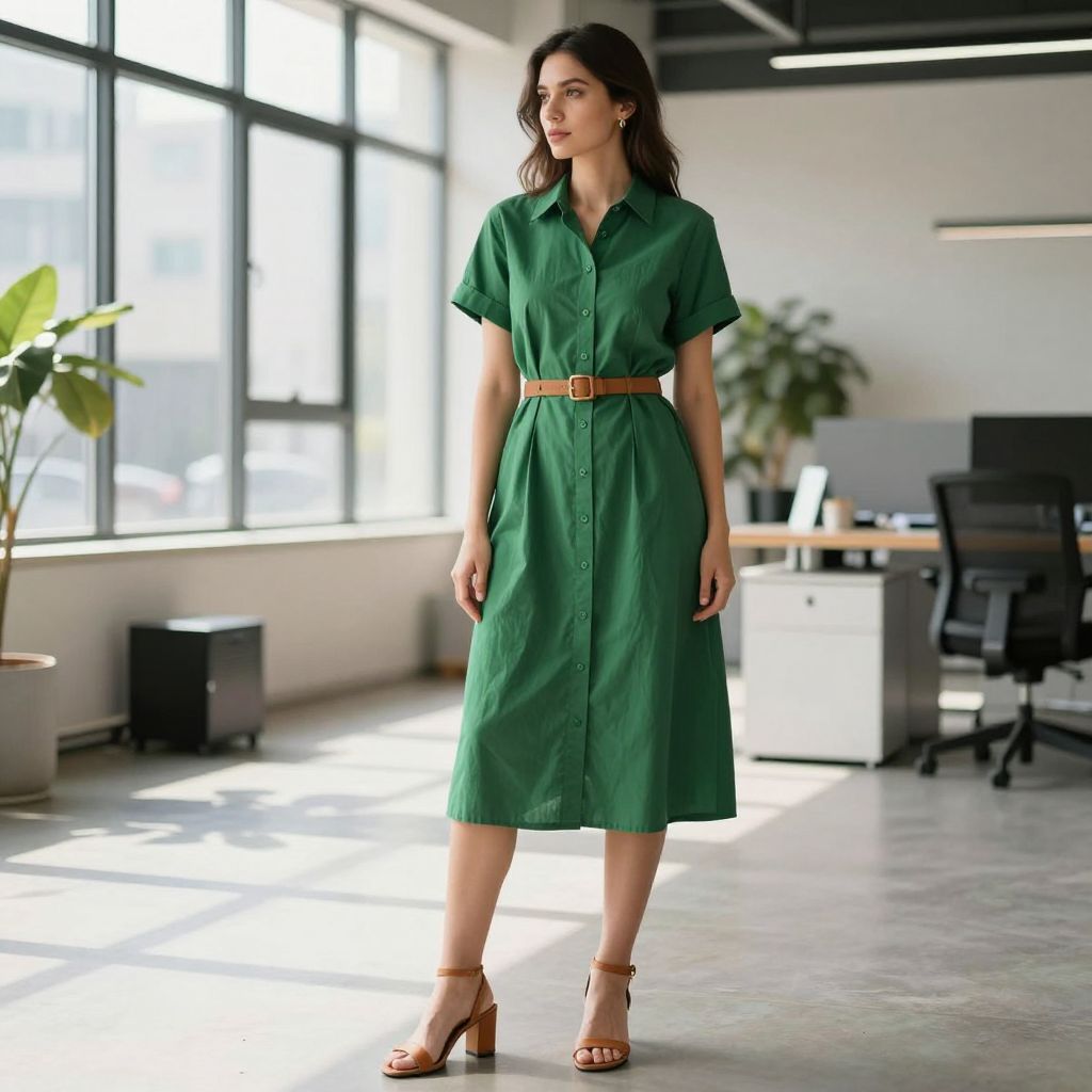 7. Deep Green Midi Shirt Dress With Tan Belt