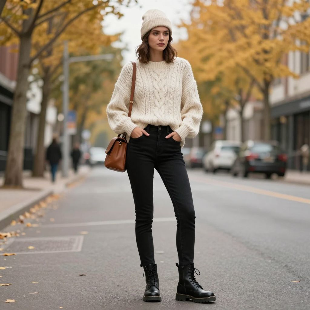 - Key pieces: cable knit sweater, black skinny jeans, leather combat boots