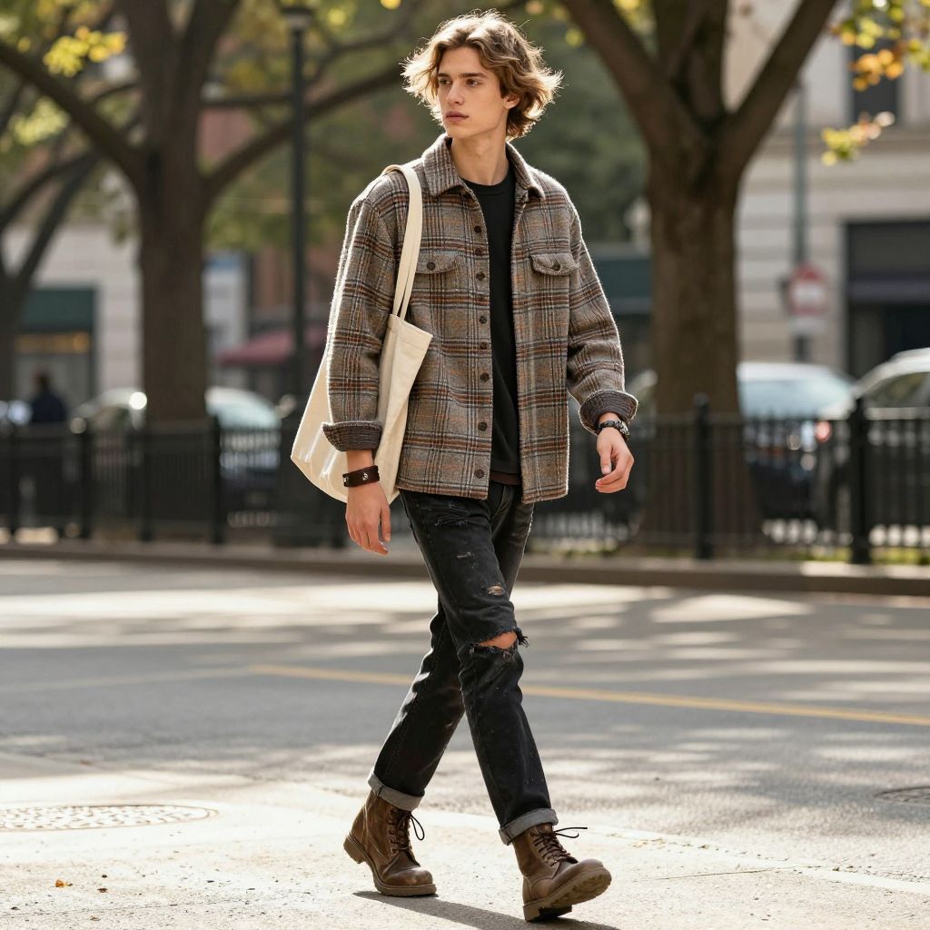 - Key pieces: plaid shirt jacket, distressed black jeans, sturdy lace boots
