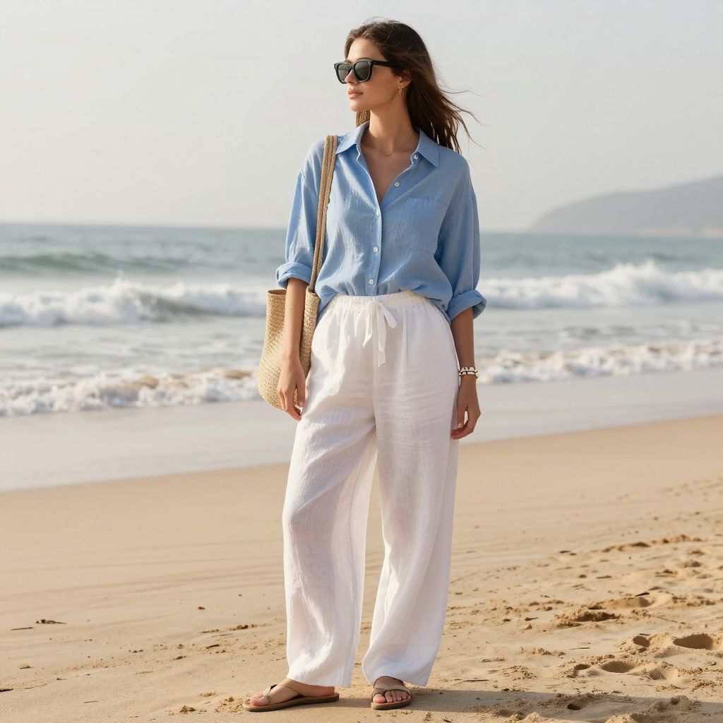 - Key pieces: White linen pants, blue cotton shirt, tan sandals, woven tote