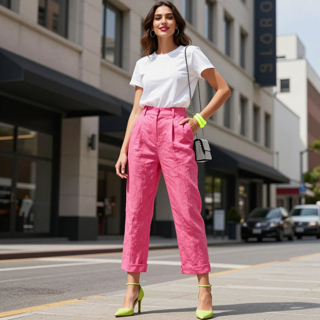 - Key pieces: Hot pink pants, white tee, lime heels, rhinestone bag