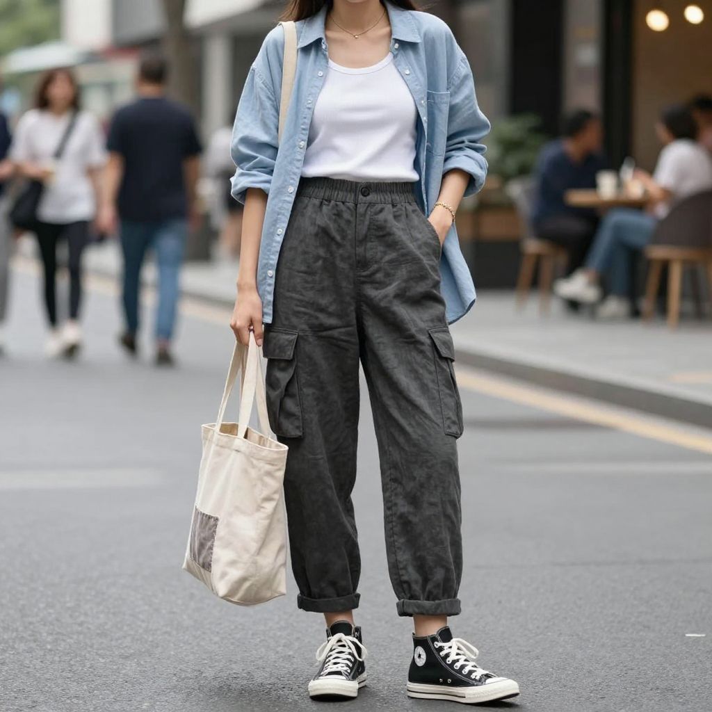 - Key pieces: Charcoal cargos, white tank, chambray shirt, high tops