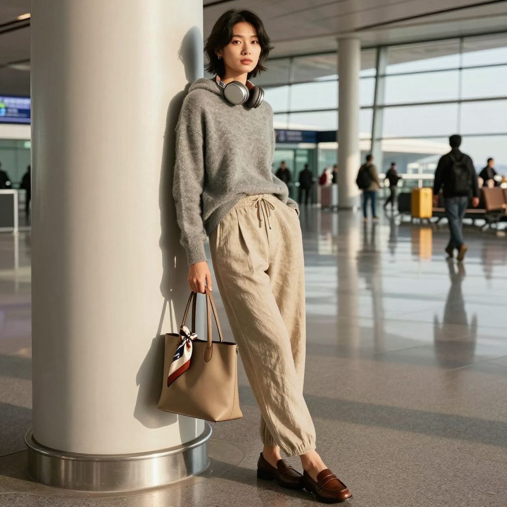 - Key pieces: Oatmeal pants, hooded sweater, loafers, tote