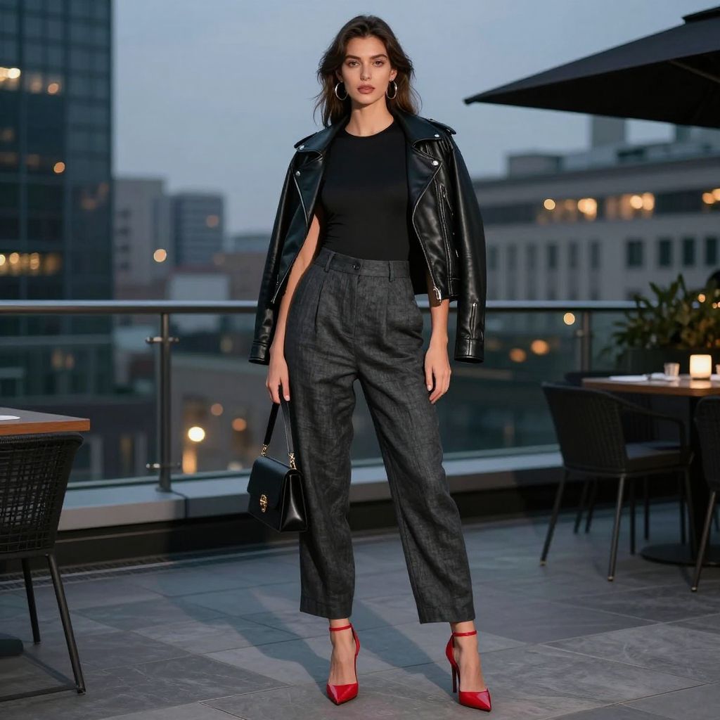 - Key pieces: Charcoal pants, black bodysuit, red heels, leather jacket