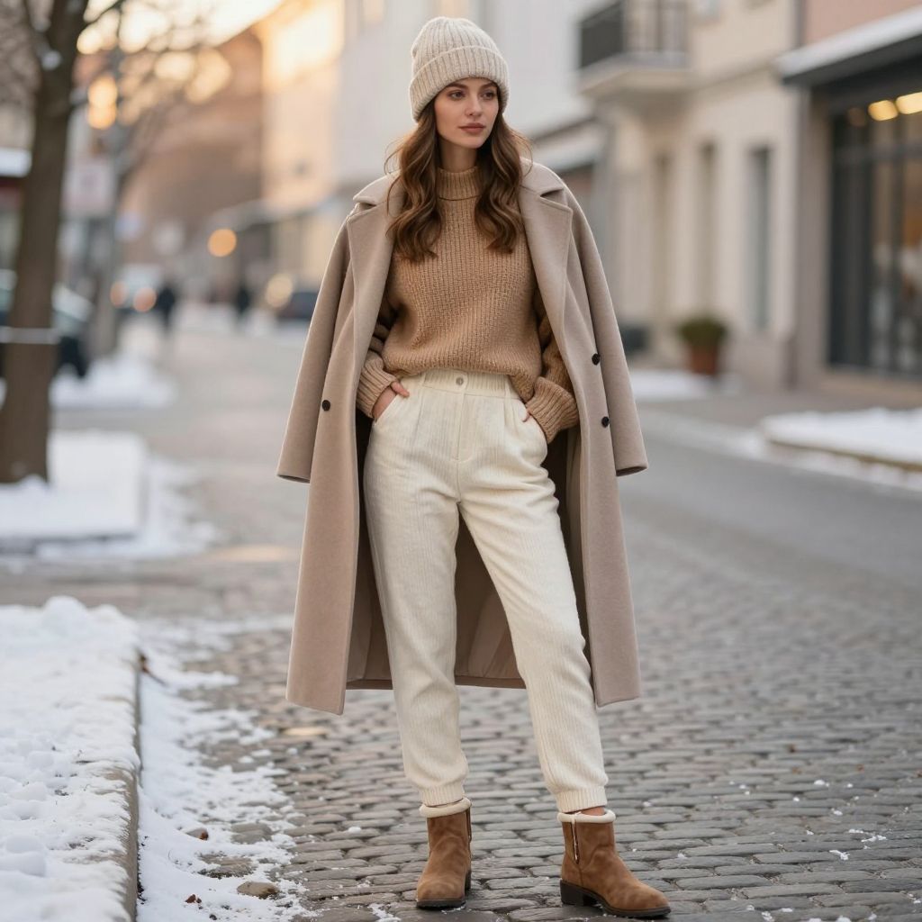 - Key pieces: Cream pants, thermal leggings, camel sweater, suede boots, coat