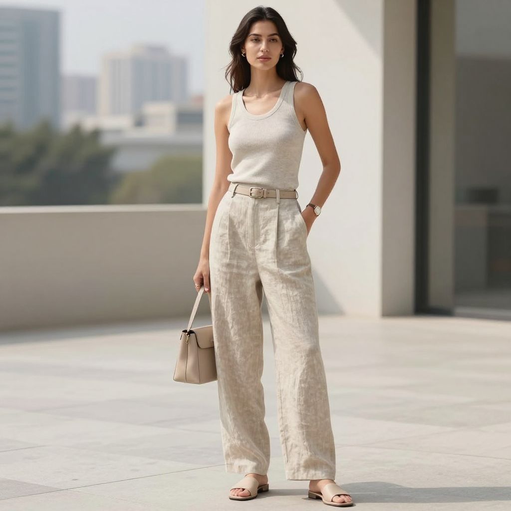 - Key pieces: Stone linen pants, matching tank, nude slides, small bag